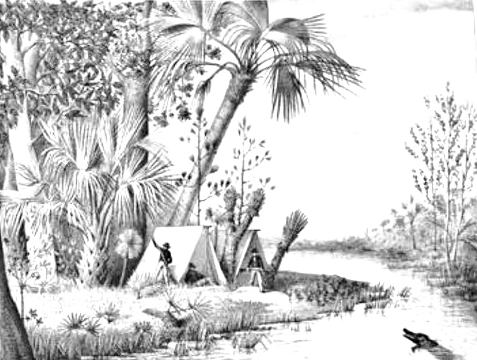 The top image is a sketch taken from Comte Francis de Castlenau‘s travels to the Wakulla River. He most certainly would not have seen many traces of Creek villages (as shown in the second image). The population had largely disappeared from the area between 1811 and 1821 when Florida became a United States Territory. Before then, the heirs to the Forbes company wanted to create Pantonia (R). It was located within the Hartfield Survey (1804, 1811) along the Wakulla River and named for the late trader William Panton. The map is attributed to Vicente Sebastián Pintado, Surveyor General of Spanish West Florida, 1805-17. Click on the blue names to see the French travel notes of Castlenau, or to go to the Pantonia map.