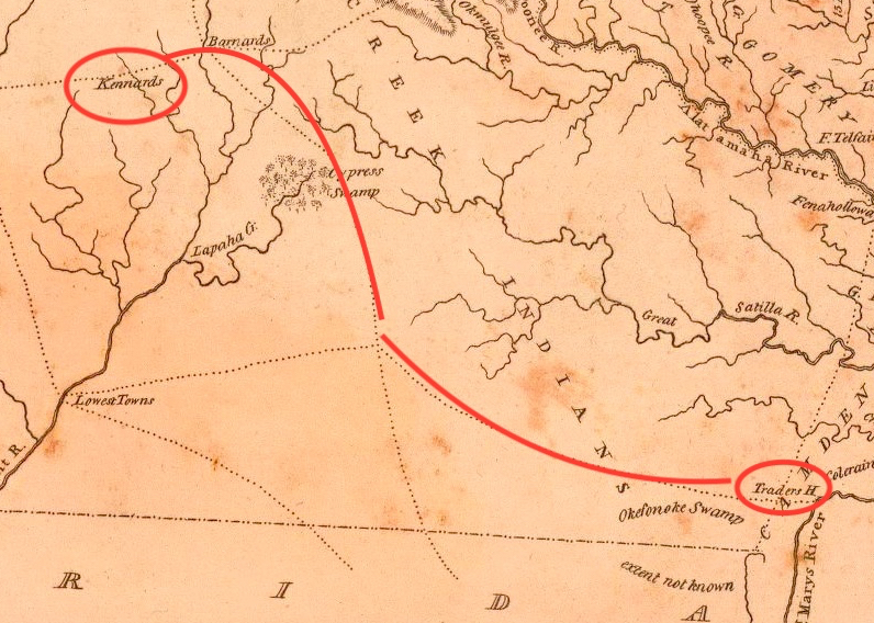 Kennard Trading Path from St. Marys River (Traders Hill) northwest to Kennard settlement near today’s Albany, GA.http://www.dav idrumsey.com