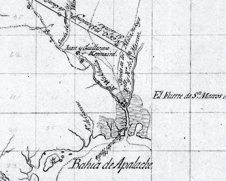 1815: At the Wakulla Spring two structures of Juan and Guillermo Kinnaird (Kennard) prompted historic and archaeological research.http://Pintado, Vicente Sebastián. Plano Borrador de las posesiones de los Señores Forbes y Compañia entre los Ríos Apalachicola y San Marcos en la Florida Occidental. Digital access to map: https://www.loc.gov/resource/g3932a.lh000880/